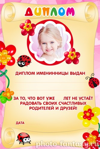 «Диплом именинницы», выполненный в ярких красочных тонах, с Божьими коровками для вставки одной фотографии очень понравится имениннице и удивит всех гостей. Добавьте онлайн на диплом фотографию и имя именинницы, и красочный диплом готов! Распечатайте диплом на цветном принтере или закажите печать у нас.